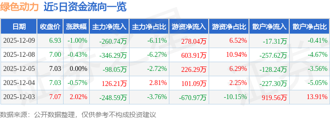 证券之星消息,截至2025年12月9日收盘,绿色动力(601330)报收于6.93元,下跌1.0%,换手率0.62%,成交量6.11万手,成交额4266.22万元。