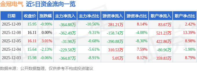 证券之星消息,截至2025年12月9日收盘,金冠电气(688517)报收于15.95元,下跌0.99%,换手率1.58%,成交量2.15万手,成交额3454.8万元。
