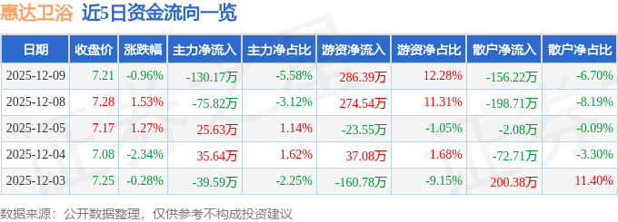 证券之星消息,截至2025年12月9日收盘,惠达卫浴(603385)报收于7.21元,下跌0.96%,换手率0.85%,成交量3.24万手,成交额2333.05万元。