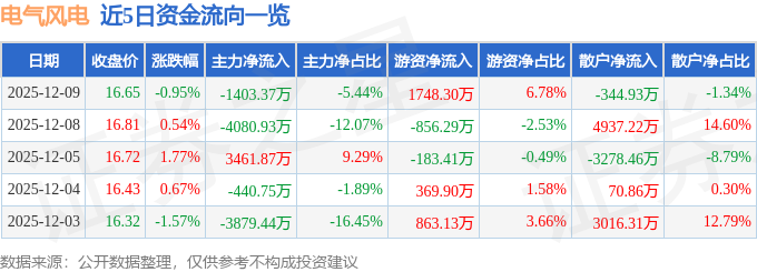 证券之星消息,截至2025年12月9日收盘,电气风电(688660)报收于16.65元,下跌0.95%,换手率1.15%,成交量15.38万手,成交额2.58亿元。