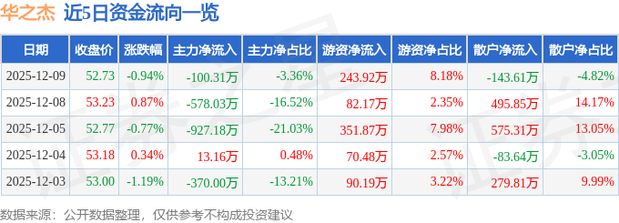 证券之星消息,截至2025年12月9日收盘,华之杰(603400)报收于52.73元,下跌0.94%,换手率2.87%,成交量5623.0手,成交额2981.76万元。