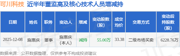 证券之星消息,根据12月9日市场公开信息、上市公司公告及交易所披露数据整理,可川科技(603052)最新董监高及相关人员股份变动情况:2025年12月8日公司董事施惠庆共减持公司股份55.0万股,占公司总股本为0.2927%。变动期间公司股价上涨2.52%,12月8日当日收盘报33.4元。