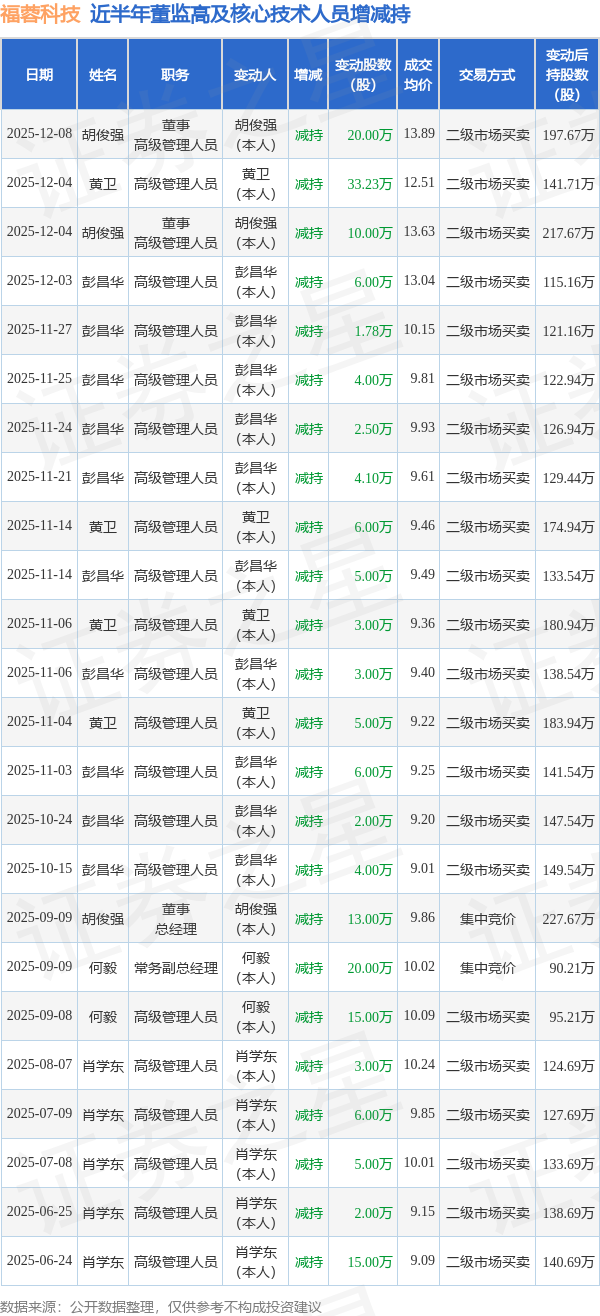 福蓉科技近半年内的董监高及核心技术人员增减持详情如下: