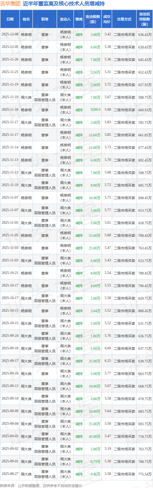 吉华集团近半年内的董监高及核心技术人员增减持详情如下:
