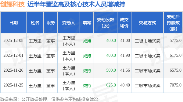 证券之星消息,根据12月9日市场公开信息、上市公司公告及交易所披露数据整理,创耀科技(688259)最新董监高及相关人员股份变动情况:2025年12月8日公司董事王万里共减持公司股份400.0股,占公司总股本为0.0004%。变动期间公司股价下跌0.1%,12月8日当日收盘报41.0元。