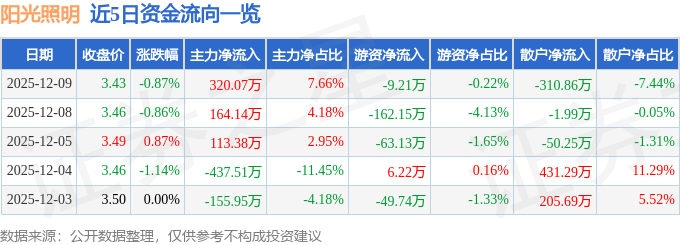 证券之星消息,截至2025年12月9日收盘,阳光照明(600261)报收于3.43元,下跌0.87%,换手率0.91%,成交量12.16万手,成交额4176.53万元。