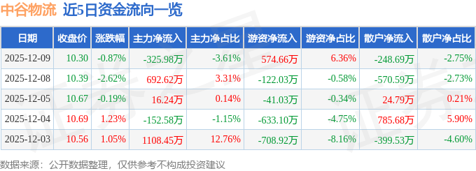 证券之星消息,截至2025年12月9日收盘,中谷物流(603565)报收于10.3元,下跌0.87%,换手率0.41%,成交量8.7万手,成交额9032.71万元。