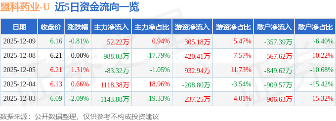 证券之星消息,截至2025年12月9日收盘,盟科药业(688373)报收于6.16元,下跌0.81%,换手率1.71%,成交量8.96万手,成交额5580.69万元。