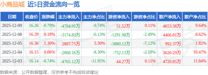 12月9日的资金流向数据方面,主力资金净流出4704.91万元,占总成交额9.74%,游资资金净流入51.52万元,占总成交额0.11%,散户资金净流入4653.38万元,占总成交额9.64%。