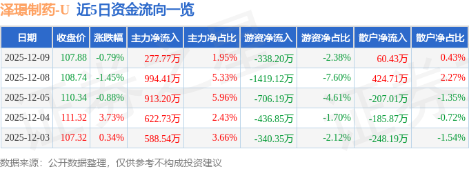 证券之星消息,截至2025年12月9日收盘,泽璟制药(688266)报收于107.88元,下跌0.79%,换手率0.49%,成交量1.31万手,成交额1.42亿元。