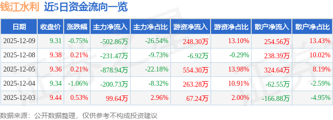12月9日的资金流向数据方面,主力资金净流出502.86万元,占总成交额26.54%,游资资金净流入248.3万元,占总成交额13.1%,散户资金净流入254.56万元,占总成交额13.43%。