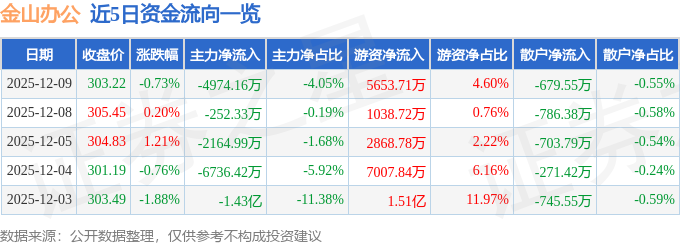 证券之星消息,截至2025年12月9日收盘,金山办公(688111)报收于303.22元,下跌0.73%,换手率0.87%,成交量4.05万手,成交额12.28亿元。