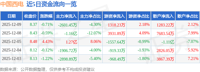证券之星消息,截至2025年12月9日收盘,中国西电(601179)报收于8.37元,下跌0.71%,换手率1.41%,成交量72.28万手,成交额6.06亿元。