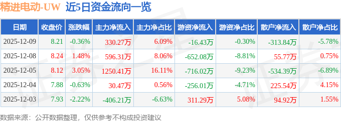 证券之星消息,截至2025年12月9日收盘,精进电动(688280)报收于8.21元,下跌0.36%,换手率1.26%,成交量6.57万手,成交额5426.08万元。