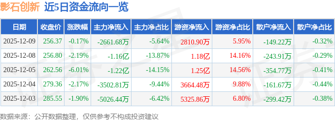 证券之星消息,截至2025年12月9日收盘,影石创新(688775)报收于256.37元,下跌0.17%,换手率5.99%,成交量1.83万手,成交额4.72亿元。