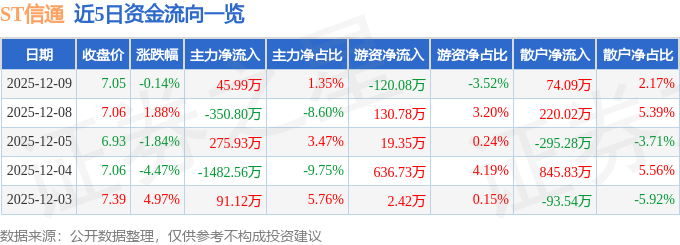 证券之星消息,截至2025年12月9日收盘,ST信通(600289)报收于7.05元,下跌0.14%,换手率0.85%,成交量4.81万手,成交额3414.0万元。