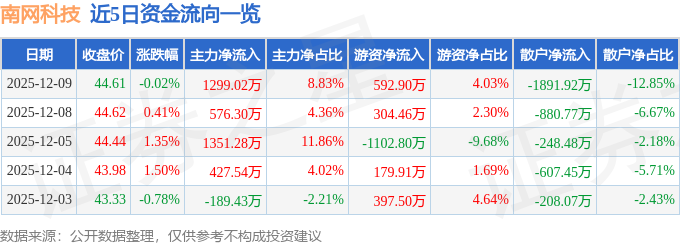证券之星消息,截至2025年12月9日收盘,南网科技(688248)报收于44.61元,下跌0.02%,换手率1.43%,成交量3.27万手,成交额1.47亿元。