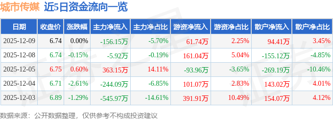 证券之星消息,截至2025年12月9日收盘,城市传媒(600229)报收于6.74元,上涨0.0%,换手率0.61%,成交量4.05万手,成交额2739.73万元。