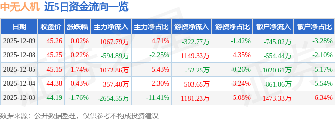 证券之星消息,截至2025年12月9日收盘,中无人机(688297)报收于45.26元,上涨0.02%,换手率0.74%,成交量5.01万手,成交额2.27亿元。