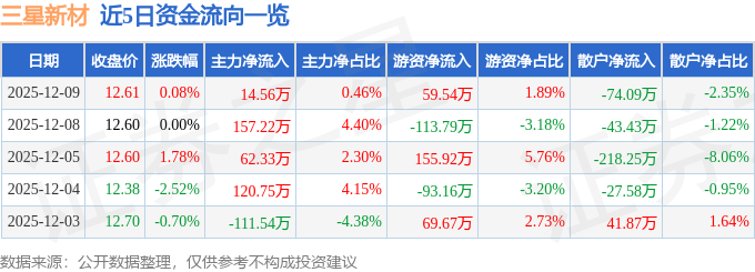 证券之星消息,截至2025年12月9日收盘,三星新材(603578)报收于12.61元,上涨0.08%,换手率1.38%,成交量2.49万手,成交额3155.44万元。