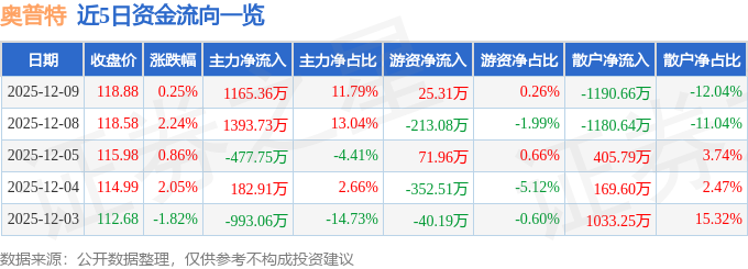 12月9日的资金流向数据方面,主力资金净流入1165.36万元,占总成交额11.79%,游资资金净流入25.31万元,占总成交额0.26%,散户资金净流出1190.66万元,占总成交额12.04%。