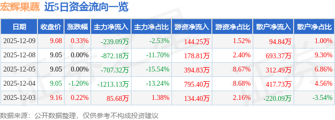 证券之星消息,截至2025年12月9日收盘,宏辉果蔬(603336)报收于9.08元,上涨0.33%,换手率1.71%,成交量10.38万手,成交额9459.94万元。