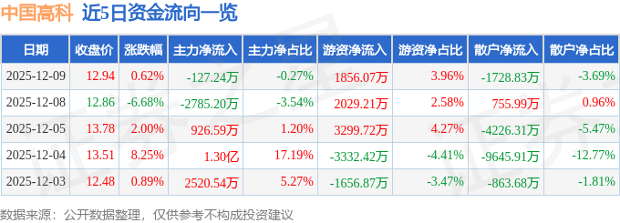 证券之星消息,截至2025年12月9日收盘,中国高科(600730)报收于12.94元,上涨0.62%,换手率6.15%,成交量36.05万手,成交额4.69亿元。