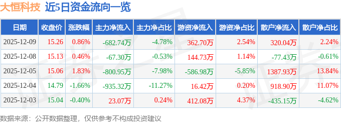 证券之星消息,截至2025年12月9日收盘,大恒科技(600288)报收于15.26元,上涨0.86%,换手率2.14%,成交量9.35万手,成交额1.43亿元。