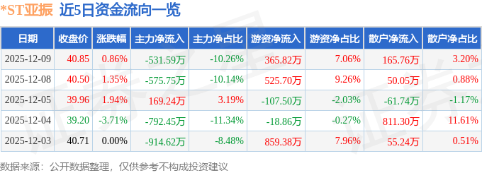 证券之星消息,截至2025年12月9日收盘,*ST亚振(603389)报收于40.85元,上涨0.86%,换手率0.48%,成交量1.27万手,成交额5180.6万元。