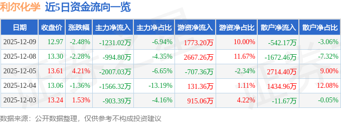 证券之星消息,截至2025年12月9日收盘,利尔化学(002258)报收于12.97元,下跌2.48%,换手率1.7%,成交量13.56万手,成交额1.77亿元。