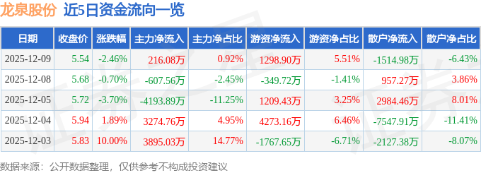 证券之星消息,截至2025年12月9日收盘,龙泉股份(002671)报收于5.54元,下跌2.46%,换手率7.69%,成交量42.26万手,成交额2.36亿元。
