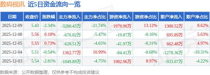 证券之星消息,截至2025年12月9日收盘,数码视讯(300079)报收于5.43元,下跌2.34%,换手率2.15%,成交量27.51万手,成交额1.51亿元。