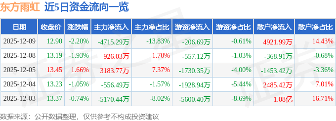 证券之星消息,截至2025年12月9日收盘,东方雨虹(002271)报收于12.9元,下跌2.2%,换手率1.37%,成交量26.17万手,成交额3.41亿元。
