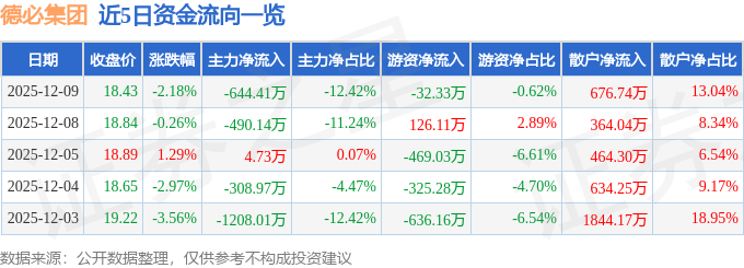证券之星消息,截至2025年12月9日收盘,德必集团(300947)报收于18.43元,下跌2.18%,换手率1.85%,成交量2.8万手,成交额5188.91万元。