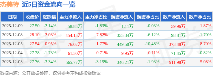 证券之星消息,截至2025年12月9日收盘,杰美特(300868)报收于27.5元,下跌2.14%,换手率1.43%,成交量1.16万手,成交额3215.16万元。