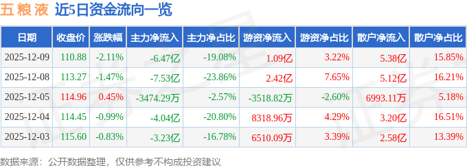 证券之星消息,截至2025年12月9日收盘,五 粮 液(000858)报收于110.88元,下跌2.11%,换手率0.78%,成交量30.43万手,成交额33.91亿元。
