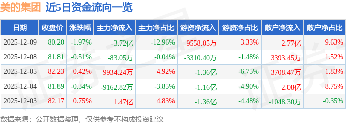 证券之星消息,截至2025年12月9日收盘,美的集团(000333)报收于80.2元,下跌1.97%,换手率0.51%,成交量35.65万手,成交额28.73亿元。