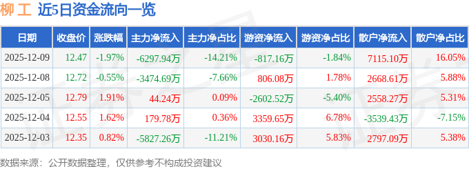 证券之星消息,截至2025年12月9日收盘,柳 工(000528)报收于12.47元,下跌1.97%,换手率1.73%,成交量35.13万手,成交额4.43亿元。