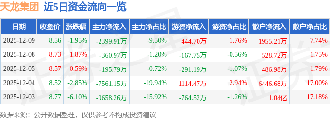 证券之星消息,截至2025年12月9日收盘,天龙集团(300063)报收于8.56元,下跌1.95%,换手率4.66%,成交量29.2万手,成交额2.53亿元。