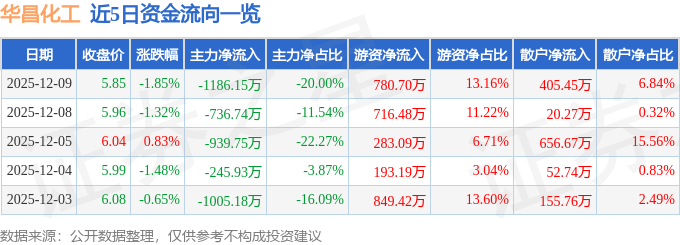 证券之星消息,截至2025年12月9日收盘,华昌化工(002274)报收于5.85元,下跌1.85%,换手率1.07%,成交量10.05万手,成交额5930.3万元。