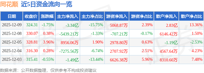 证券之星消息,截至2025年12月9日收盘,同花顺(300033)报收于324.31元,下跌1.75%,换手率2.36%,成交量6.5万手,成交额21.17亿元。