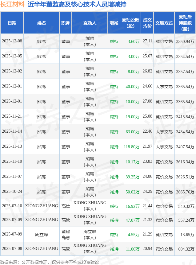 长江材料近半年内的董监高及核心技术人员增减持详情如下: