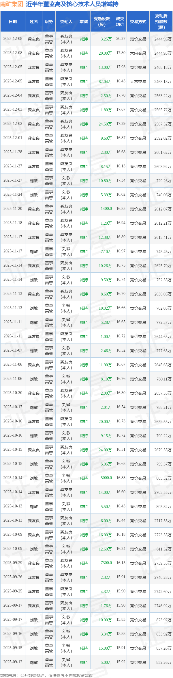 证券之星消息,根据12月9日市场公开信息、上市公司公告及交易所披露数据整理,南矿集团(001360)最新董监高及相关人员股份变动情况:2025年12月8日公司董事,高管龚友良共减持公司股份23.25万股,占公司总股本为0.1139%。变动期间公司股价上涨9.98%,12月8日当日收盘报20.72元。