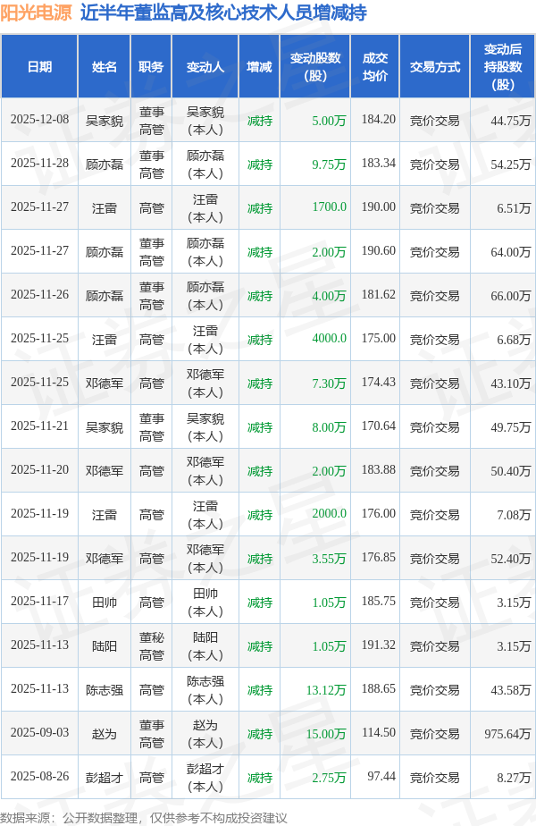 阳光电源近半年内的董监高及核心技术人员增减持详情如下: