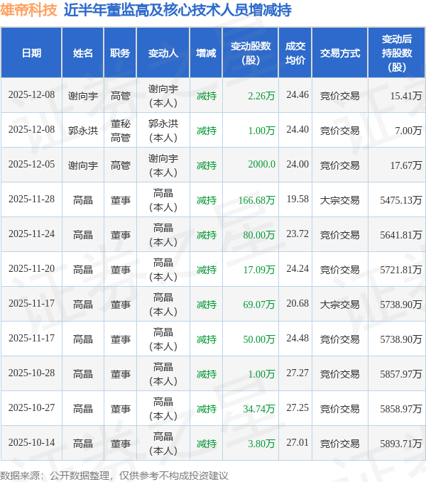 雄帝科技近半年内的董监高及核心技术人员增减持详情如下: