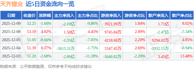 证券之星消息,截至2025年12月9日收盘,天齐锂业(002466)报收于52.25元,下跌1.6%,换手率2.76%,成交量40.79万手,成交额21.31亿元。