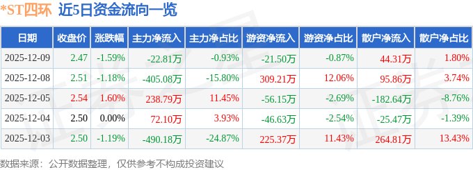 12月9日的资金流向数据方面,主力资金净流出22.81万元,占总成交额0.93%,游资资金净流出21.5万元,占总成交额0.87%,散户资金净流入44.31万元,占总成交额1.8%。