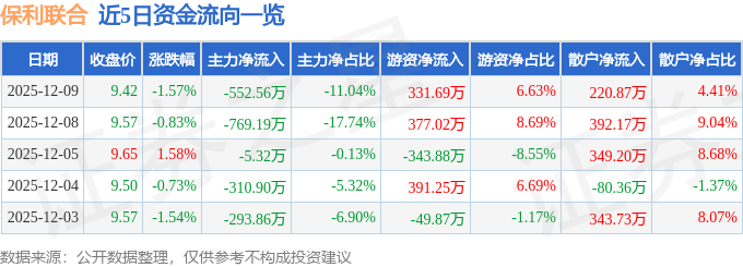 证券之星消息,截至2025年12月9日收盘,保利联合(002037)报收于9.42元,下跌1.57%,换手率1.09%,成交量5.28万手,成交额5003.35万元。