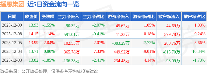 12月9日的资金流向数据方面,主力资金净流出90.32万元,占总成交额2.07%,游资资金净流入45.62万元,占总成交额1.05%,散户资金净流入44.69万元,占总成交额1.03%。