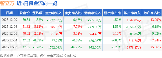 证券之星消息,截至2025年12月9日收盘,智立方(301312)报收于50.54元,下跌1.52%,换手率4.27%,成交量2.59万手,成交额1.32亿元。